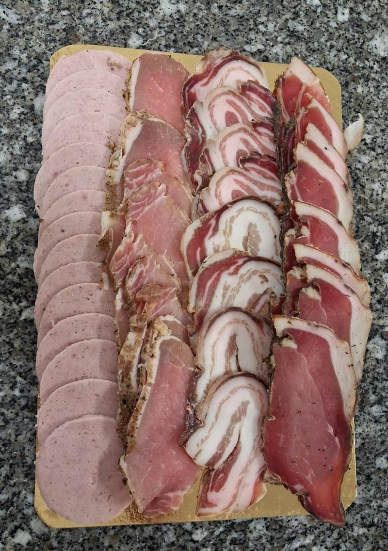 charcuterie sur la photo: saucisse de jambon, bacon, pancetta, jambon cru fumé