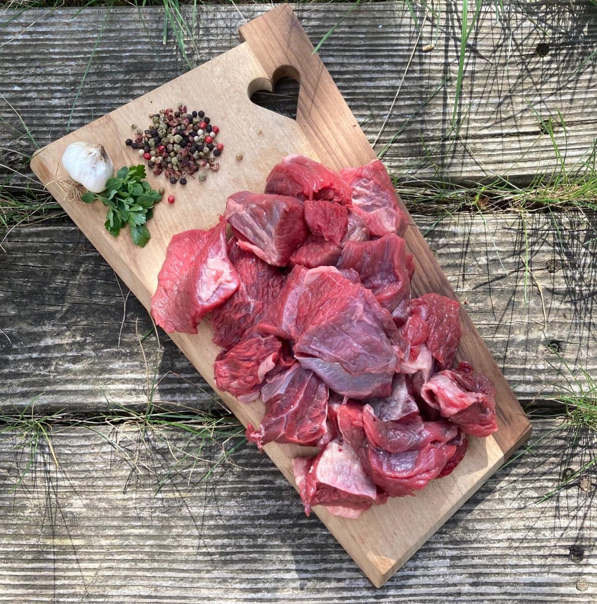 Viande à bourguignon, en dés, viande race limousine, agriculture biologique, mis sous-vide. Environ 600 g