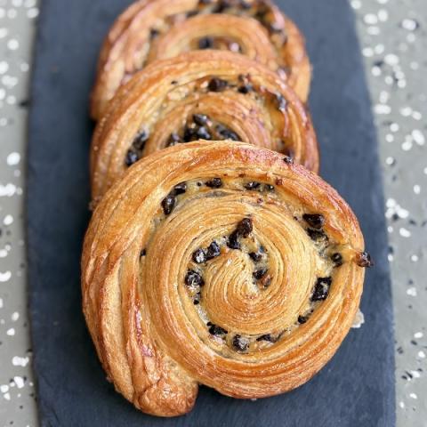 Composés de pâte à croissant, crème pâtissière et pépites de chocolat noir.