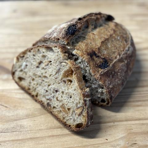 Pain fabriqué avec notre farine de blé T80, du levain naturel et des noix. Façonné à la main, il est cuit dans un four à bois.