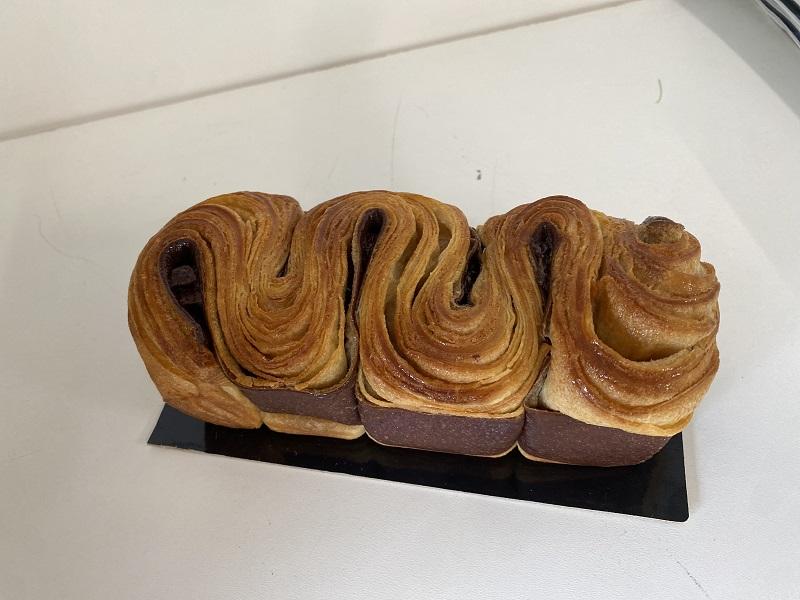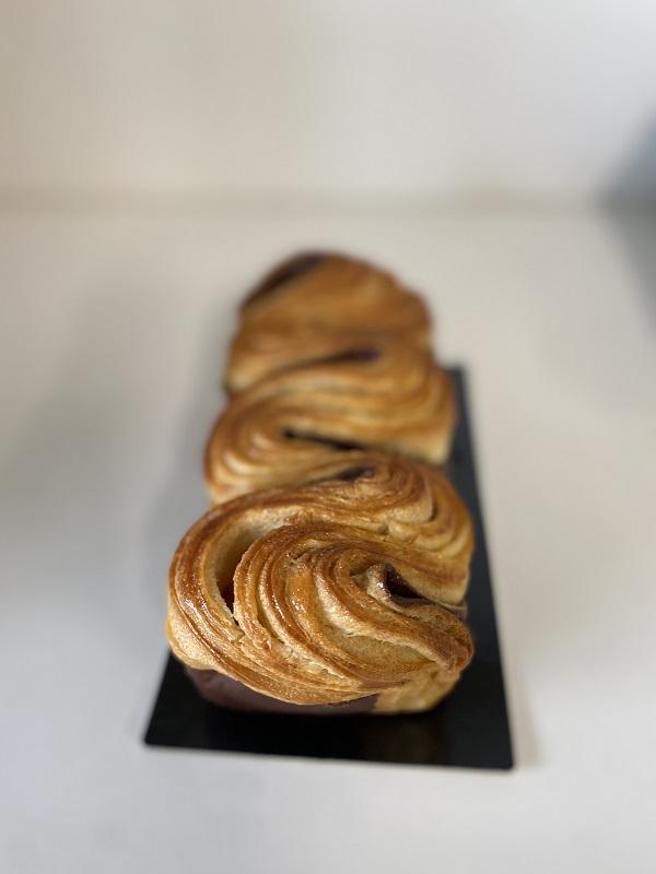 Brioche de 225g réalisée avec une pâte à brioche feuilletée maison bicolore au cacao et intercalée de barrettes de chocolat noir.