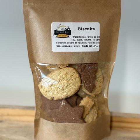 Assortiment de biscuits secs élaborés avec notre farine de blé T80 moulue à la ferme et cuits dans notre four à bois.