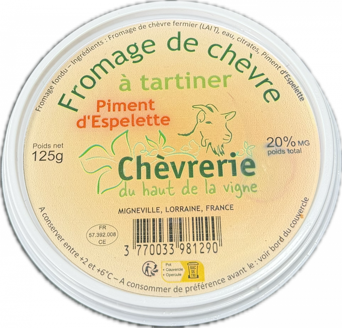 Ingredients: Lait entier pasteurisé de nos chèvre (lactose), sel, présure, eau, citrates, Piment d'Espelette.