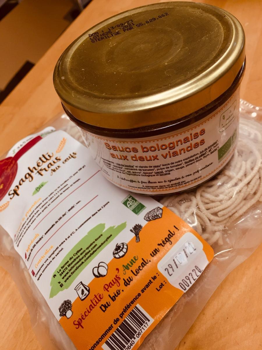250g de spaghetti frais et un pot de 180g de sauce bolognaise cuisinée avec notre viande.