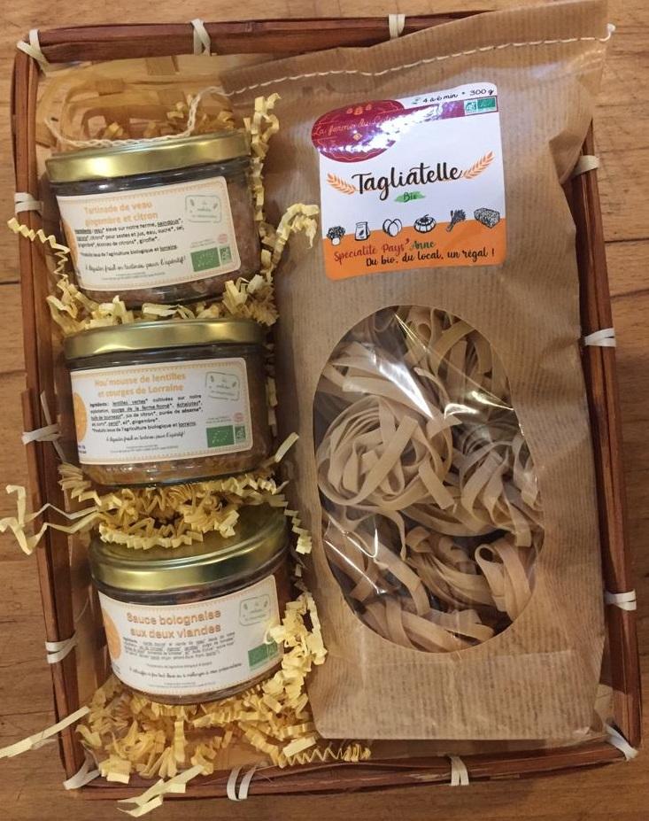 Un panier garni avec nos produits secs à mettre sous le sapin, pour un noël 100% bio et local !